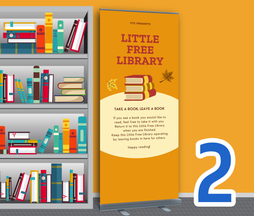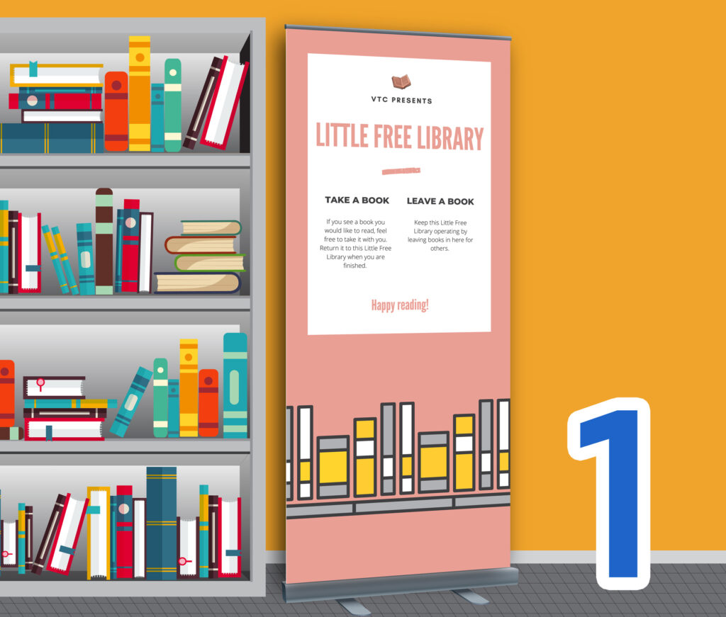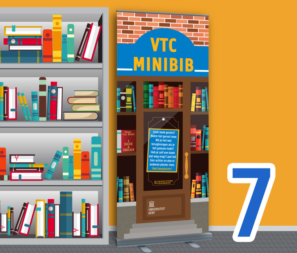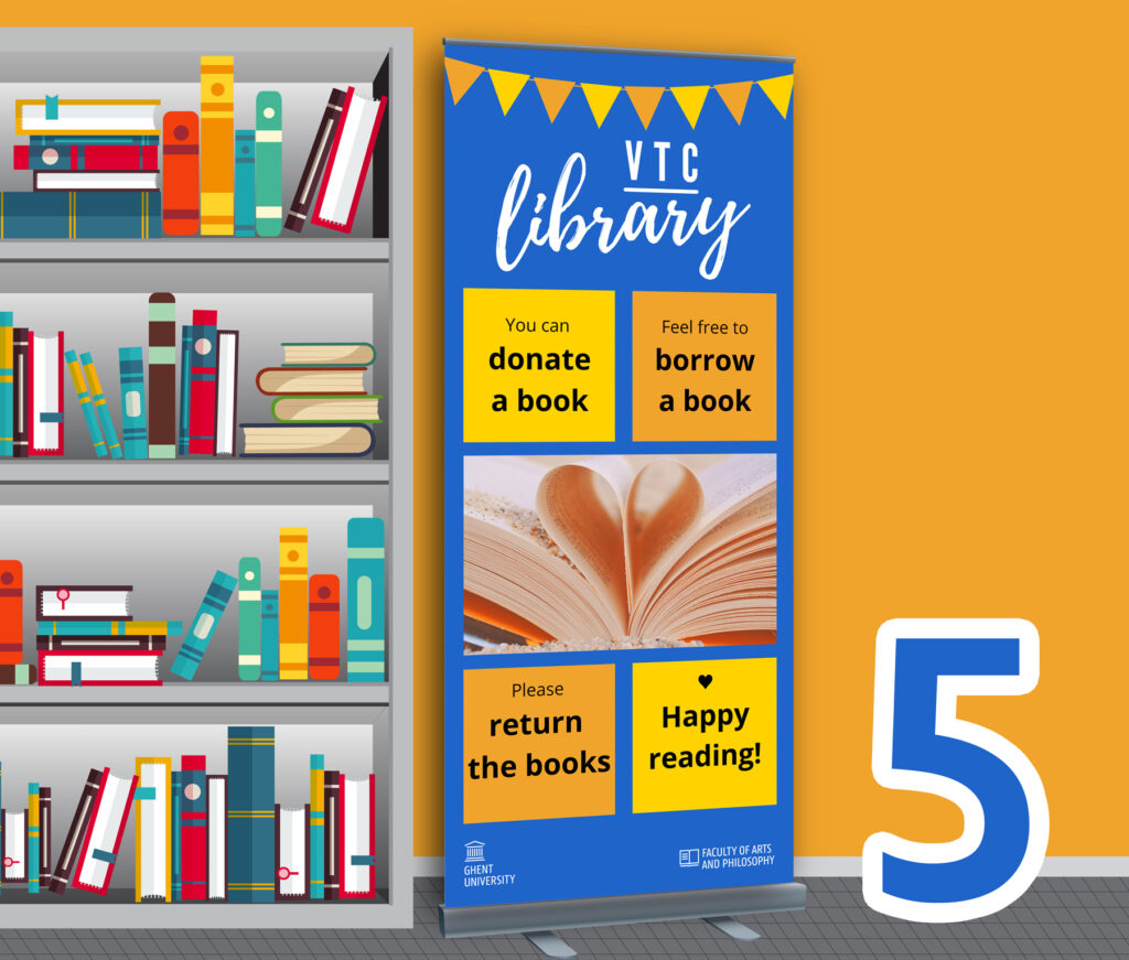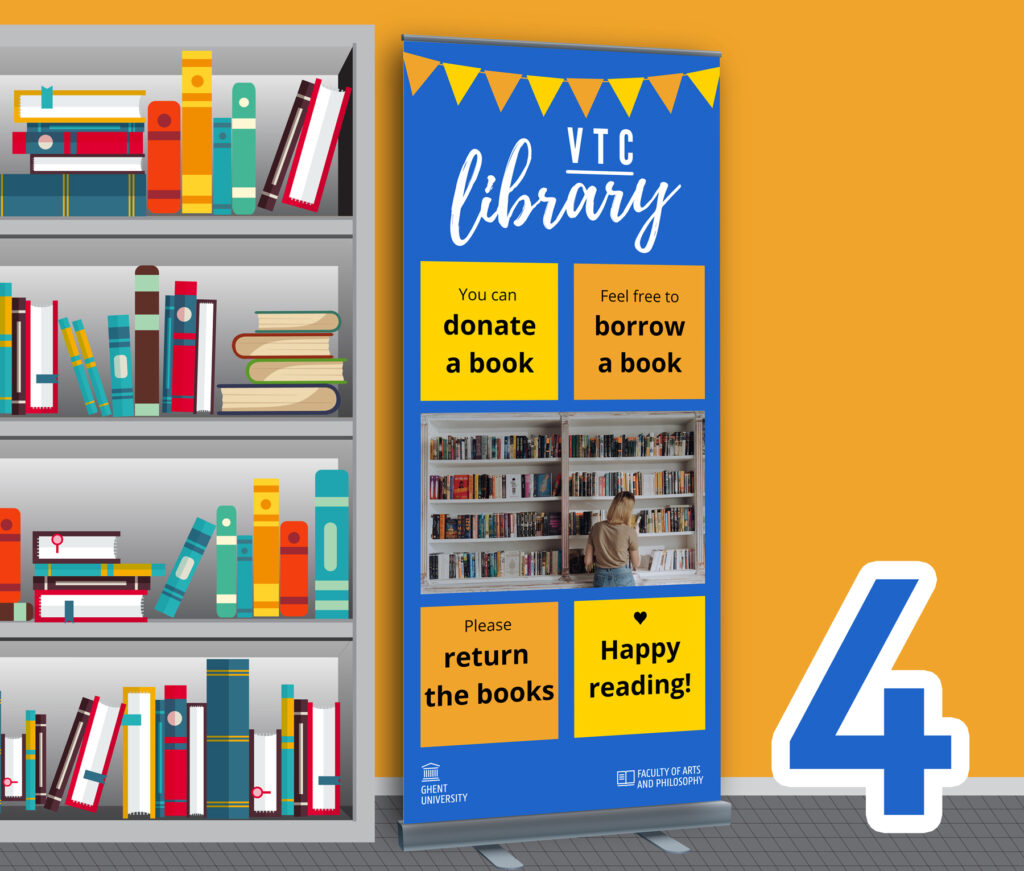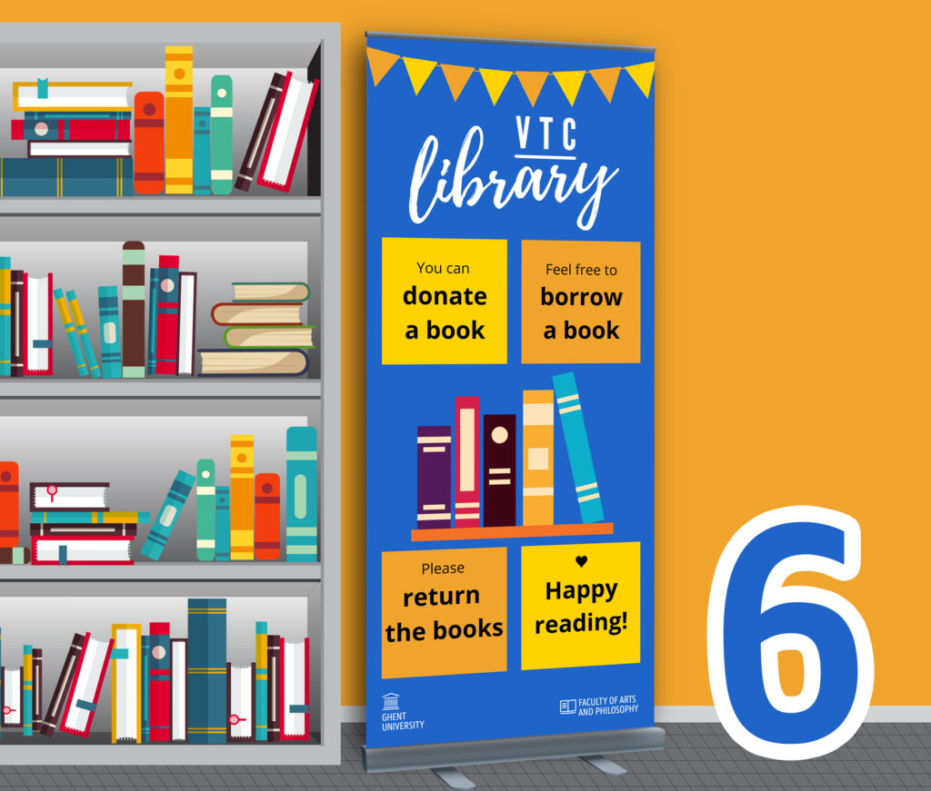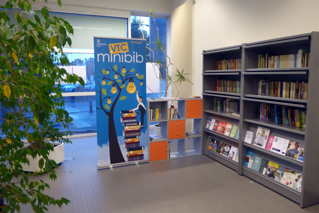 Onze ruilbibliotheek was oorspronkelijk een idee van (toenmalig) studente Nynke Van Roost. Dankzij haar voorstel werd een oproep gelanceerd, waarop studenten en medewerkers massaal boeken en ook kasten doneerden. Parallel werd er nog een ontwerpwedstrijd voor de banner georganiseerd, waar zowel studenten als docenten aan deelnamen, en ten slotte verkozen de studenten hun favoriete banner, die nu netjes staat te blinken bij onze eigen VTC-ruilbibliotheek.